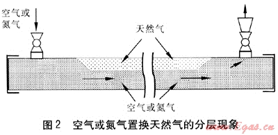 在氣體對氣體的置換過程中密度小的氣體(如天然氣)在密度大的氣體(如空氣、氮氣)的上方流動,或者密度大的氣體在密度小的氣體下流動時,容易出現兩種氣體分層流動的現象,稱之為分層現象[2]。天然氣置換空氣或氮氣的分層現象見圖1,空氣或氮氣置換天然氣的分層現象見圖2。