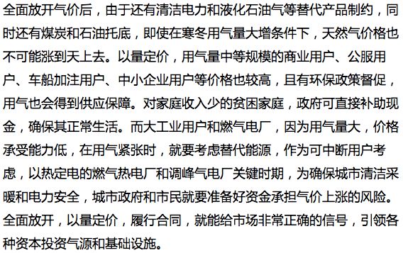 全面放開,以量定價。任何商品都是零售價格高,批發價格低,買的越多就應該折扣越多,價格越便宜。天然氣價格改革全面放開,以量定價也應該符合基本市場原則,也符合壓力和壓強的關系,天然氣大工業用戶或大型燃氣電廠由于用氣量大,同等天然氣價格波動產生的壓力對其成本和贏利能力形成的壓強巨大,需求彈性大;而居民用氣量小,用戶多且分散,同等天然氣價格波動產生的壓力對其使用形成的壓強較小,需求彈性小。燃氣供應商在滿足居民、商業、公服、車船加注等眾多分散用戶,要投入更多人力、物力和財力,其成本要遠遠大于穩定生產的大工業用戶或燃氣電廠。按照以量定價原則,居民用氣應該價格最高,而目前價格體系正好相反,這就是冬天燃氣商為獲得利潤,優先滿足高價用戶需求,造成居民用氣氣荒的根本原因。