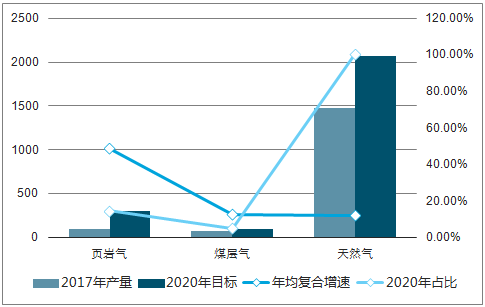 從能源結構上看,我國是一個多煤、多氣和少油的國家。目前,我國能源結構調整在加快,天然氣在能源結構中的比重呈平穩(wěn)快速攀升之勢,天然氣在能源結構中的地位日益凸顯。隨著天然氣價格改革逐步到位,以及未來頁巖氣的開發(fā)利用,我國能源結構“氣化”進程將進一步加快。近兩年我國天然氣在能源消費中的比例上升,但與世界能源消費平均水平相比,我國天然氣在能源結構中所占比例最低。提升天然氣在能源結構中的比例,對優(yōu)化我國的能源結構非常有益。未來三年,我國天然氣供給能力將明顯增強。 根據《天然氣發(fā)展“十三五”規(guī)劃》,到 2020 年我國天然氣產量有望由 2017 年的 1487 億方增至 2020 年的 2070 億方,增量達到 583 億方。從增量結構來看,頁巖氣、煤層氣的產量將分別從 2017 年的 91 億方、 70 億方增至 2020 年的 300 億方、 100 億方,兩者增量合計為 239 億方,占總增量的比重為 41%,同時非常規(guī)氣占比也提升至 19%。預計未來三年我國國產氣將維持常規(guī)氣穩(wěn)步生產,非常規(guī)氣優(yōu)先發(fā)展的大格局。