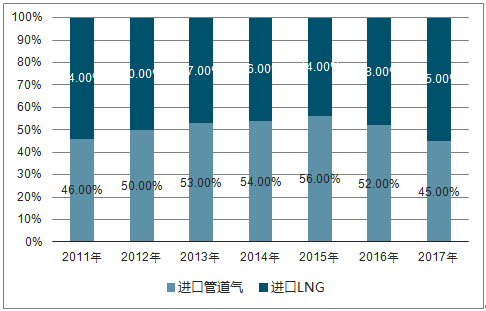 2015 年開始,我國進口天然氣中 LNG 的占比呈逐年上升的態(tài)勢,并在 2017 年超過管道氣,成為我國最主要的進口氣來源。 2017 年,我國共進口天然氣 6872 萬噸,其中進口 LNG 3813 萬噸,占比由 15 年的 44%提升至 17 年的 55%。