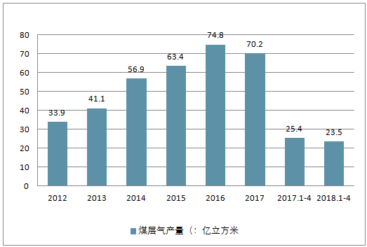 2017 年我國共實現(xiàn)煤層氣產量 70.2 億立方米, 2012-2017年年均復合增長率為 15.7%,同時今年前四個月累計產量為 23.5 億立方米,同比增速為 8%(可能由于統(tǒng)計口徑問題,實際數據較 2017 年略有下降)。