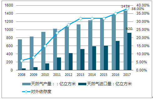 2008-2017 年,我國天然氣進口量由 46 億方增長至 920 億方,年均復合增速 34.9%,而在產量方面, 2008 年我國天然氣產量為 803 億立方米, 2017 年則達到了 1474 億立方米,年均復合增長率為 6.97%,遠低于進口量與消費量的增長水平。隨著進口量的不斷增加,我國天然氣行業(yè)對外依存度也由 2008 年的 5.9%提高到 2017 年的 38%。