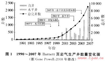 開發技術的創新尤其是水平井鉆井、壓裂技術以及裂縫綜合診斷技術的進步與廣泛運用在推動沃斯堡盆地Barnett頁巖氣藏的快速發展中起著至關重要的作用。1981年,Barnett頁巖區在按計劃鉆探過程中偶然發現顯示良好的Barnett頁巖層段。自1981年第一口發現井到1992年歷經10a生產井僅99口,開發緩慢。1997年后,水力壓裂開始取代凝膠壓裂成為頁巖氣主要的增產措施,Barnett頁巖氣的開發也隨之加快了前進的步伐。隨著1999年重復壓裂、2003年水平鉆井以及2005年水平井分段壓裂等一系列新技術的廣泛運用,Barnett頁巖氣發展速度驚人(圖2),從1997~2007年的10a時間里,Barnett頁巖氣區有多達8629口頁巖氣井投入生產(其中水平井4973口,占50%以上)。新技術的運用同樣使Barnett頁巖氣產量發生了翻天覆地的變化,截至2008年1月,Barnett頁巖氣產量約0.996×108m3/d,累計產量1044.9×108m3[3]。