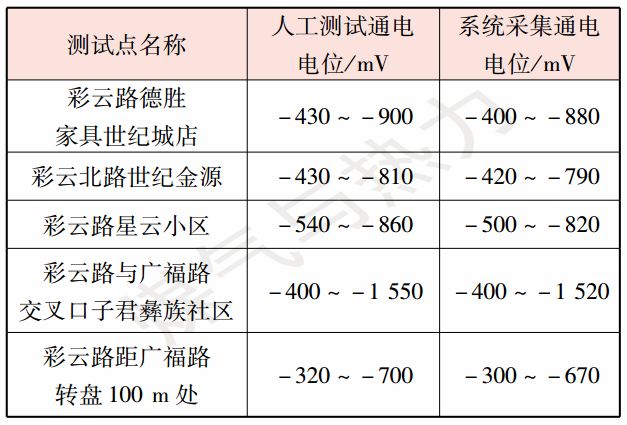 在近地鐵處選取5個測點,人工測試選用便攜式參比電極測量通電電位。人工測試數據與系統測試數據的對比見表1。