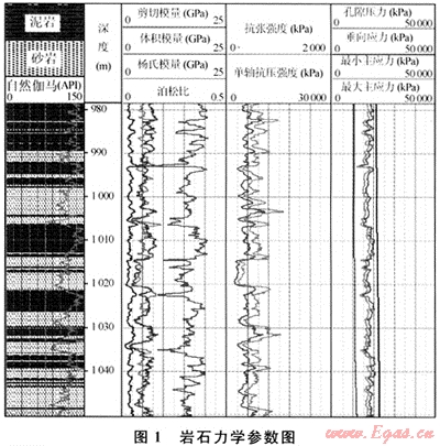 地層的孔隙壓力、體積模量、楊式模量、單軸抗壓強度、最小水平主應力方向等參數是出砂預測的重要參數。這些參數均可在實驗室和氣井生產過程得到,但得出的數據是離散的且成本較高。目前已經有成熟的利用測井方法求散巖石力學參數的方法[1],筆者采用Schlumberger公司的STARS軟件,以縱波時差、橫波時差、補償密度、泥質含量和地層孔隙度為輸入曲線,求取巖石的彈性模量和巖石強度。圖1為計算得到的地層的巖石力學參數,這些參數將用于出砂預測。