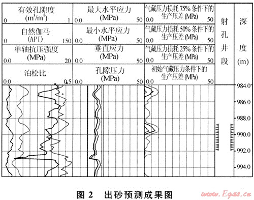 圖2中,988.7~992.0m井段為射孔層位。處理結果表明,在初始氣藏壓力條件下,地層臨界出砂的生產壓差為1~10MPa;如果氣藏壓力下降25%(見氣藏壓力損耗25%條件下的生產曲線),那么,該射孔層位下部會出砂。