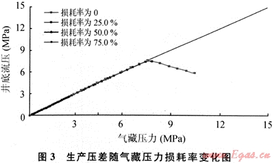 圖3為生產壓差隨氣藏壓力變化而變化圖。橫軸為氣藏壓力,縱軸為井底流壓。折線上方為不出砂區域(小于生產壓差),折線下方為出砂區域(大于生產壓差)。圖3中可以看出,氣藏壓力越小,則井底流壓越小。對于該氣藏而言,隨著氣藏壓力的降低,井底流壓變小,生產壓差變小,出砂是不可避免的。