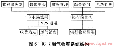 大慶燃氣公司IC卡燃氣收費系統是依托計算機網絡建立的燃氣銷售信息管理系統,它融合了當今成熟的數據庫技術及網絡技術,實現了燃氣銷售的實時開戶、售氣、售氣信息管理等功能。IC卡燃氣收費系統結構見圖6,IC卡燃氣收費系統包括收費服務器、數據中心、財務管理、綜合查詢、系統管理,由收費服務器和銀行前置機實現上述功能。
