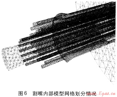 本文應(yīng)用CFD軟件對(duì)割嘴內(nèi)外圈氧氣與丙烷的流動(dòng)和燃燒做了冷態(tài)、熱態(tài)模擬。模擬計(jì)算的模型包括割嘴內(nèi)部氣體流場(chǎng)和割嘴外部空間氣體流場(chǎng)兩部分,因?yàn)楦钭焓侵行膶?duì)稱的,所以只模擬整個(gè)割嘴的一半。總體幾何模型見圖3,其中割嘴外部空間是直徑為200mm,長(zhǎng)度為1600mm的半圓柱體。割嘴內(nèi)部模型見圖4,包括高壓切割氧孔道、內(nèi)外圈預(yù)熱氧孔道、燃?xì)饪椎馈HS網(wǎng)格劃分情況見圖5、6,其中圖6是圖5的局部放大圖。