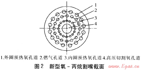 由于不同燃?xì)饩哂胁煌男再|(zhì),若在原來的氧-乙炔割嘴上直接使用丙烷來進(jìn)行氣割,就會(huì)有火焰分散無力、氣割速度緩慢、點(diǎn)火困難、不易調(diào)節(jié)的缺點(diǎn)。因此必須設(shè)計(jì)專用的氧-丙烷氣割割嘴才能滿足氣割要求。丙烷的熱值比乙炔高,丙烷的燃燒溫度比乙炔的燃燒溫度低。需要重新調(diào)整可燃?xì)怏w與氧氣的比例,降低丙烷-氧氣混合氣體的噴出速度,才能保證良好的燃燒。