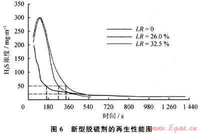 我國GB 17820一1999《天然氣》規定,城市管道天然氣中硫化氫含量標準為:一類天然氣中硫化氫含量不大于6mg/m3,二類天然氣中硫化氫含量不大于20mg/m3,三類天然氣中硫化氫含量小于460mg/m3。而GB 18047—2000《車用壓縮天然氣》規定,車用壓縮天然氣中硫化氫含量不大于15mg/m3。由圖5可以看出,LR>14.3%的脫硫劑,硫化氫穿透時間長于300s,即300s內產品氣中不含硫化氫,符合一類城市管道天然氣和車用天然氣用氣要求。