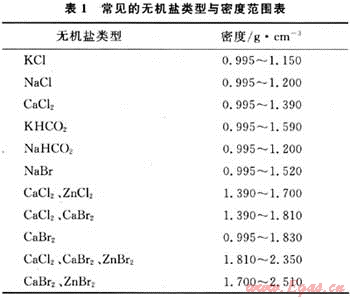 完井液、壓井液體系所采用的加重材料主要是可溶性無機鹽類,主要用來增加或調節完井液、壓井液的密度,常見的無機鹽及其密度范圍,見表1。對高含H2S的油氣井,進行完井修井作業所采用的體系中不宜采用ZnCl2、ZnBr2作為加重材料,除非采用新型除硫劑技術,以免因產生ZnS沉淀破壞液體性能的穩定性,甚至誘發井下安全事故發生和損害地層。