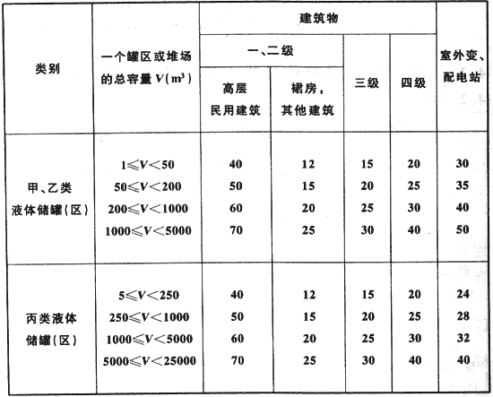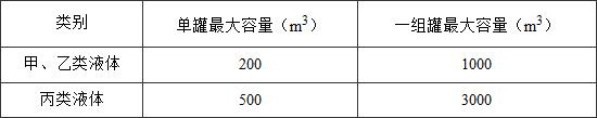 注:1 當甲、乙類液體儲罐和丙類液體儲罐布置在同一儲罐區時,罐區的總容量可按1m3甲、乙類液體相當于5m3丙類液體折算。