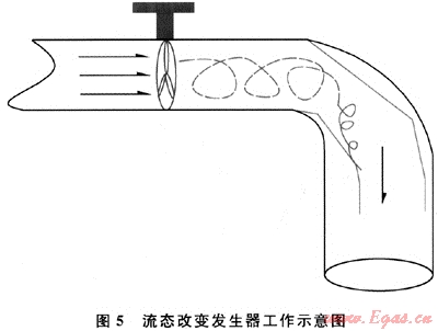 2) 可考慮在彎管前增加流體流態改變發生器。由圖2可知,在彎管內壁外側后段和內壁內側前段易形成湍流,產生空泡腐蝕。因此,可在流體進入彎管前增加一個流體流態改變裝置,預先給流體增加一個反向旋渦,避免在彎管處產生強烈的渦流,減緩腐蝕,工作原理見圖5。