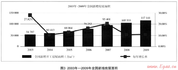 從中華人民共和國國家統計局網站公布的年鑒中了解到,全國新增房屋面積從2003年的54707萬m2到2009年的1171412萬m2,每年都保持增長趨勢。此間6年中,中國新增住房面積年復合增長率達13.53%。同時,隨著城市人口的增加和消費結構的升級,人們越來越注重環保和生活品質,城市管道燃氣尤其是管道天然氣需求越來越大,而未來的城市小康住宅示范居住小區將會大面積的使用新型智能化的燃氣計量表,相應地燃氣表行業特別是智能燃氣表行業將迎來大發展時期。