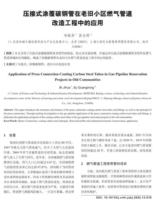本文介紹了壓接式涂覆碳鋼管材及管件的構造、特點及壓接原理,并通過對壓接式涂覆碳鋼管及管件在燃氣管道領域的應用跟蹤,闡述了涂覆碳鋼管在老舊小區燃氣管道改造工程中的應用前景。