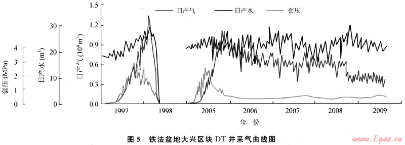 鐵法盆地大興區(qū)塊DT井為直井,1996年12月投產(chǎn),日產(chǎn)氣最高1.35×104m3,平均日產(chǎn)水21.8m3,生產(chǎn)15個(gè)月后關(guān)井,2004年重新開井,穩(wěn)產(chǎn)4a遞減,目前日產(chǎn)氣0.5×104m3,已累計(jì)采出1017×104m3,劃分為上升-穩(wěn)產(chǎn)-遞減3個(gè)階段(圖5),即阻礙-暢通-低飽和3個(gè)解吸階段。