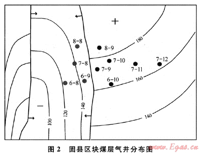 沁水煤層氣田固縣區(qū)塊投產(chǎn)10口煤層氣井(圖2),煤層埋深、厚度、頂?shù)装鍘r性、煤質(zhì)等參數(shù)基本相同,但排采效果差別大。6口高產(chǎn)井平均產(chǎn)氣量4115m3,產(chǎn)水量極小。4口未產(chǎn)氣井,產(chǎn)水量很大,累計(jì)產(chǎn)水1800~2800m3。其原因是10口井位于兩個(gè)不同的地質(zhì)單元,成藏條件不同;斷裂鼻狀構(gòu)造和斷裂背斜構(gòu)造軸部氣富水貧,斷槽內(nèi)氣貧水富:固6-10、7-9、7-10、7-11、7-12、8-9井6口高產(chǎn)氣井位于斷鼻和斷裂背斜軸部,煤層分布穩(wěn)定,頂?shù)装宸馍w條件好,含氣量高;而固6-8、6-9、7-8、8-8井4口未產(chǎn)氣井都位于兩條斷層夾持的斷槽向斜內(nèi)。由于小斷層發(fā)育,煤層連續(xù)性遭到破壞,含氣量降低,被稱為水槽,單井日產(chǎn)水幾十立方米。