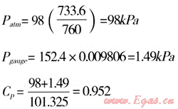 若已知一個低壓系統的壓力=152.4mm水柱,該地離海平面的高程差為304.8m,當地大氣壓為736.6mmHg,基礎大氣壓為760mmHg。換算系數1mm水柱=0.009806kPa。