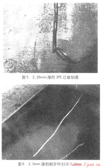 國內外法定檢驗機構的檢測結果表明,雙層環(huán)氧聚合物混凝土結構涂層具有比3PE更優(yōu)異的耐劃傷性(圖5、6)、耐磨損性,其補口處與管體同高,還與陰極保護系統(tǒng)有很好的匹配性。帕羅特已被美國定向穿越工程承包協(xié)會DC CA(Directional Crossing Contractors Association)指定為定向穿越覆蓋層專用保護產(chǎn)品。