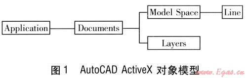 Documents對象下面有Model Space(模型空間)及Layers(圖層)等一系列對象集合。Model Space是圖形文件中的圖形實體集合,如Line(直線),每個實體均可通過相應對象的屬性進行操作,改變或得到相應的參數,如直線坐標。Layers是圖層集合,通過對Layers對象的引用可以得到圖層集合的子對象,如Layer。