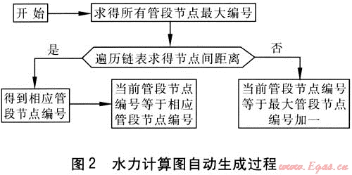 計算管段鏈表中已標注的管段節點編號的最大值。對管段鏈表進行遍歷,求得當前需要標注的管段節點與已標注的管段節點的距離,若滿足要求,則當前管段節點編號等于相應的管段節點編號;若不滿足要求,則當前管段節點編號等于已標注的管段節點編號的最大值加1。水力計算圖自動生成過程見圖2。