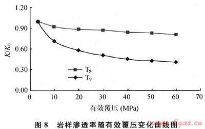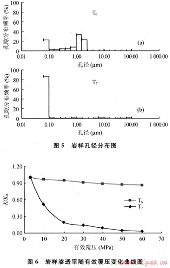 T6(K0’=12.62×10-3μm2,φ0=14.8%)和T7(K0’μm2,φ0=3.7%)是孔滲參數差=0.079×10-3異較大的兩塊巖樣。從巖樣的孔徑分布圖與覆壓滲透率變化曲線(圖5、6)可以看出:對于低孔低滲透巖樣,小孔徑占了絕大多數,在覆壓實驗中,小孔道一旦受到壓縮發生塑性變形就會嚴重喪失滲流功能,導致巖樣的滲透率大幅下降,表現出較強的應力敏感性。