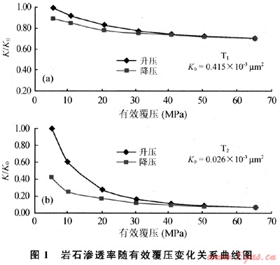 圖1是采用CMS300測得的低滲透巖石滲透率與有效覆壓關系曲線。從圖1可看出:①巖樣初始滲透率(K0’越低,滲透率在有效覆壓增加的過程中的下降幅度越大;②滲透率在有效覆壓增大的初始階段下降幅度最大,覆壓降低后滲透率不能完全恢復,說明巖樣在實驗過程中發生了微量的軟塑性變形。)
