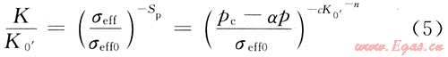 曲線斜率的絕對值,表示應力敏感程度;K0’為有效覆壓為σeff0時的滲透率,即巖心初始滲透率(或常規滲透率),10-3μm2;φ0為巖石常規孔隙度;K為有效覆壓為σeff(即孔隙壓力為p)時的滲透率,10-3μm2;c、n為擬合系數;pc為實驗中為圍壓,儲層條件時為儲層上覆壓力,MPa;p為孔隙壓力(地層壓力),MPa;α為有效應力系數,在低滲透砂巖儲層條件下其取值范圍為0.9~0.98。參考文獻