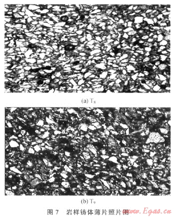 巖石受力過程中,最先發生變形的是泥質和膠結物,這些物質的含量越高,巖石發生軟塑性變形的程度越大,則巖石在覆壓實驗中滲透率的下降幅度越大。對T8和T9兩塊巖樣進行鑄體薄片觀察(圖7),得知T9的填隙物含量和泥質含量均高于T8(物性參數見表1),從圖8可知T9的應力敏感性強于T8。對于不同的油氣藏,因成藏過程不同,其巖石成分有較大差異,因而應力敏感性也會存在差異。