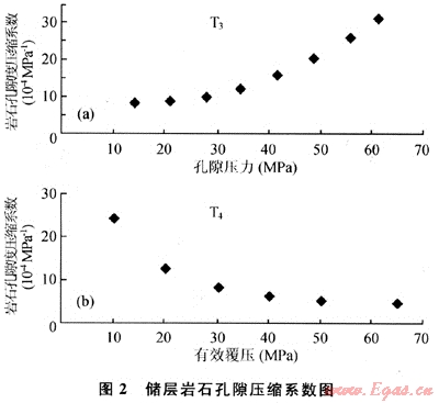 圖2是采用增加圍壓與降低孔隙壓力兩種方法所測得的巖石孔隙壓縮系數與應力的關系曲線。從圖2中可以看出是變化值而非固定值,初始值很高,隨著圍壓增大、孔隙壓力減小,下降很快,圍壓、孔隙壓力達到一定值后,變化不大,保持穩定,這表明在實驗過程中巖石發生的并非理想的線彈性變形。