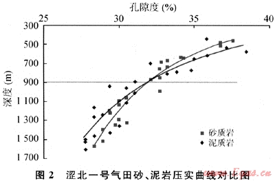 壓實作用是沉積物最重要的成巖作用之一,它導致孔隙水排除,孔隙度減少,巖石體密度增加。三湖地區第四系地層主要的成巖作用是壓實作用,不同巖性其壓實特征不盡相同。研究表明,壓實早期對泥巖的影響較對砂巖顯著,0~2000m深度范圍內,頁巖的孔隙度隨深度的變化速率相對較大,而砂巖的變化速率相對較小,在相同深度范圍內,泥質巖物性變化的速率總比砂質巖性大(圖2)。特別是深度超過900m,由于地層水的大量排出,泥巖塑性消失,已相當致密且明顯成層;粉砂巖已趨于點接觸,但是膠結物較少,仍較疏松。泥質巖壓實程度超過砂質巖,兩者排替壓力差逐漸增大,泥巖層易形成側向封堵,有利于巖性氣藏形成。