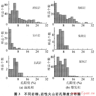 火山巖儲(chǔ)層形成受多因素的控制。火山巖相控制了儲(chǔ)層原生孔隙和原生裂縫,是好儲(chǔ)層形成的基礎(chǔ),爆發(fā)相為火山巖相最有利的相帶。對(duì)979塊火山巖樣品的孔隙度進(jìn)行統(tǒng)計(jì)顯示:爆發(fā)相優(yōu)于溢流相;爆發(fā)相中角礫巖的物性最好,凝灰?guī)r次之(圖3)。
