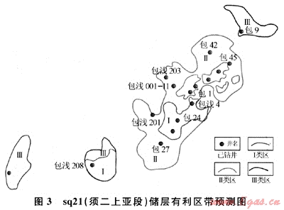在對sq21(須二上亞段)進行儲層分類評價時,以儲能系數(shù)大于1、0.5~1、小于0.5分布作為Ⅰ、Ⅱ、Ⅲ儲層的分類依據(jù),以區(qū)塊內(nèi)是否有獲得工業(yè)油氣流井作為分類的劃分標準。Ⅰ類有利區(qū)位于鼻狀構(gòu)造上,儲層發(fā)育好,儲能系數(shù)大于1,且有工業(yè)氣流井;Ⅱ類有利區(qū)位于鼻狀構(gòu)造上,儲層發(fā)育較好,儲能系數(shù)為0.5~1,且有工業(yè)氣流井;Ⅲ類有利區(qū)位于鼻狀構(gòu)造之外,但儲層較發(fā)育,儲能系數(shù)在0.5~1。綜合評價出Ⅰ類有利區(qū)4個,Ⅱ類有利區(qū)2個,Ⅲ類有利區(qū)3個。Ⅰ類有利區(qū)塊位子包22井-包24井-包淺4井區(qū)、包21-包1-包淺001-6井區(qū)、包33井-包16井-包45井井區(qū)、包淺208井區(qū);Ⅱ類較有利區(qū)塊位于包淺201-包27井區(qū)、包淺203-包淺001-11井區(qū)、包42井區(qū)(圖3)。