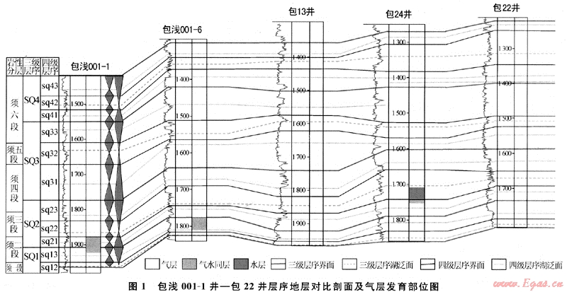 三級層序(SQ1~SQ4)的層序界面為不整合面或大型沖刷侵蝕面。層序界面在地震剖面中表現(xiàn)為削截與上超等反映地層不協(xié)調(diào)關(guān)系的地震反射,代表區(qū)域性的侵蝕間斷或無沉積型的間斷[2~4]。SQ1底界為須一段與下部嘉陵江組五段白云巖或雷口坡組二段石灰?guī)r的超覆不整合面。SQ4頂界為須六段與上部地層自流井不整合接觸面。SQ2、SQ3、SQ4的底界分別為發(fā)育于須二、須四、須六段大套砂巖內(nèi)部的大型沖刷侵蝕面[5~6],其主要特征為:①底部存在礫石或者泥礫,礫石有時有定向排列,有時雜亂無章,這種泥礫層在剖面上可連續(xù)追蹤,自然伽馬曲線呈箱形或鐘形,底部呈突變接觸關(guān)系;②發(fā)育大規(guī)模的起伏不平的侵蝕面,侵蝕底面明顯下切到先前的沉積體中,下切深度一般為1m左右;③有時存在風化形成的黏土層或者菱鐵礦結(jié)核,此類現(xiàn)象出現(xiàn)在水上暴露的環(huán)境中;④有時存在大規(guī)模的植物莖干的堆積并且與其他巖性混雜在一起,此類現(xiàn)象一般發(fā)育在水下環(huán)境中的相對靜水湖灣地帶等;⑤有時發(fā)生物源的改變,比如由石英巖屑砂巖突變?yōu)殚L石巖屑砂巖,由于長石遭受風化而在露頭剖面上形成一個松軟帶。