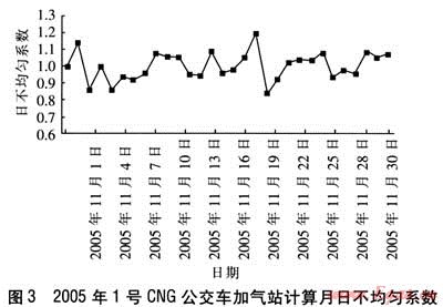 仍以1號CNG公交車加氣站為例,2005年該CNG公交車加氣站月高峰系數出現在2005年11月,該月的日不均勻系數見圖3。2005年該CNG公交車加氣站11月份的日高峰系數出現在2005年11月18日,數值為1.197;日不均勻系數的最小值出現在2005年11月19日,數值為0.841。