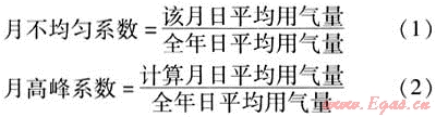 燃氣用戶全年中各月的用氣不均勻情況用月不均勻系數來表示,逐月日平均用氣量出現最大值的月份稱為計算月,月不均勻系數最大值稱為月高峰系數。月不均勻系數和月高峰系數的計算公式為: