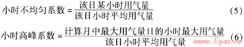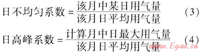 日不均勻系數表示1個月中日用氣量的變化情況,最大日不均勻系數稱為日高峰系數。日不均勻系數和日高峰系數的計算公式為: