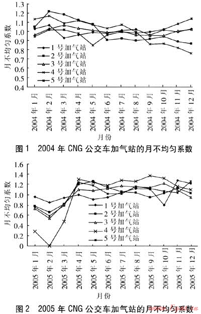根據采集到的5座CNG公交車加氣站的加氣量數據,按式(1)計算得到各站2004年、2005年的月不均勻系數,見圖1、2。