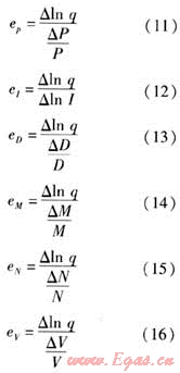 根據(jù)式(9)對居民生活用氣量指標進行彈性分析。彈性分析的目的在于得到居民生活用氣量指標對其影響因素的微小變化所做出的反應。居民生活用氣量指標相對各項影響因素的彈性如下: