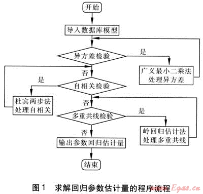 根據(jù)橫截面數(shù)據(jù)樣本,采用最小二乘法對式(9)進行參數(shù)估計,得到滿足經(jīng)典回歸假設檢驗的回歸參數(shù)。求解回歸參數(shù)估計量程序流程見圖1。