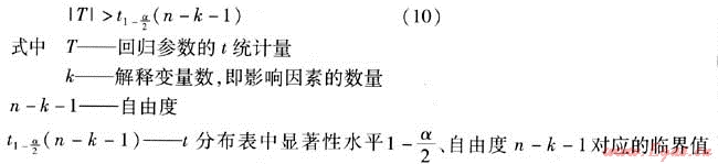 對求得的回歸參數(shù)進行t檢驗,若回歸參數(shù)的t統(tǒng)計量滿足式(10),則認為此回歸參數(shù)對應的項目對居民生活年燃氣消耗量q有顯著影響,否則認為影響不顯著。