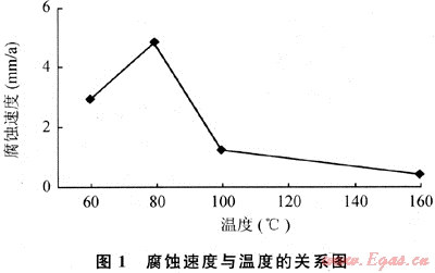 根據徐深氣田4口氣井(徐深1-1、徐深1、徐深5、徐深6井)的水質特征,配制了實驗溶液。通過實驗發現:隨著溫度的升高,CO2腐蝕速度增加,當達到80℃時,腐蝕速度達最大值;超過80℃后,可能形成的腐蝕產物更加致密,從而導致腐蝕速度逐漸減小;到160℃后,腐蝕速度更小(見圖1)。根據上述實驗結果,制定了徐深氣田徐家圍子區塊腐蝕環境參數實驗條件:溫度80℃,CO2分壓2.0MPa。實驗采用了美國Cortest公司生產的動態高壓釜,流速2.5m/s,經過24h、48h和96h動態實驗,利用失重法計算試片腐蝕速率。