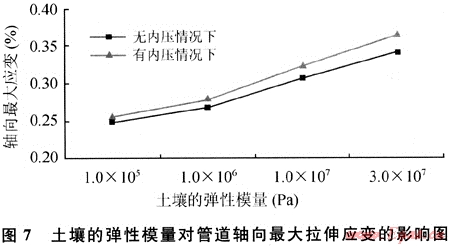 改變管溝內土壤的彈性模量,計算得到的管道軸向最大拉伸應變值,如圖7所示。計算結果表明:隨著管溝內土壤的彈性模量的減小,管道所受的軸向拉伸應變分別以11.05%、14.06%和7.82%的速率減小。據此可得到在軟土環境中管道可以抵抗更大的斷層位移,而在硬土環境中管道的拉伸應變比較大的結論。