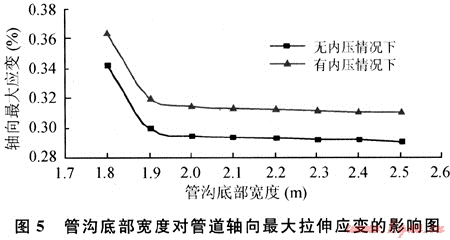 依據GB 50251—2003《輸氣管道工程設計規范》[8],深度在5m以內時,溝底寬度應按下式確定:B=D+K,其中B為溝底寬度,m;D為管子外徑,m,該算例取1.219m;K為溝底加寬裕量,m,一般不少于0.5m。所以該算例中管溝底部寬度B≥1.719m(1.219m+0.5m),因此管溝底部寬度的最小值取1.8m。改變管溝底部寬度,計算得到的管道軸向最大拉伸應變值如圖5所示。結果表明:隨著管溝底部寬度的增大,管道所受的軸向最大拉伸應變減小,而且在從1.8m增加到1.9m時發生突變。由此可見管溝底部寬度取1.9m時比較經濟,再寬挖的意義不大。
