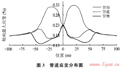 穿越該斷層的管道主要受軸向拉伸應力作用,因而可在只控制管道軸向最大拉伸應變情況下分析各參數對管道應變的影響。管道軸向坐標建立在管道穿越斷層處。在斷層作用下管道的應變分布見圖3,從圖上可以看到管道最大應變出現在斷層兩側30m范圍內。