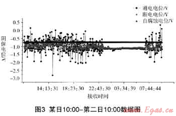 比較通電電位、斷電電位及自然腐蝕電位可見,在干擾嚴重時間段,通電電位變化幅度大于斷電電位變化幅度,這是由于通電電位中包含雜散電流造成的IR降的影響,變化幅度從理論上要大于斷電電位。由于自然電位的試片不與管道電連接,因此,其不受管道中流入流出雜散電流的干擾,電位穩定。有了自然電位,不僅可以用-850mV CuS04極化電位準則判定,而且可以利用1OOmV極化偏移準則對保護效果進行判斷陰極保護效果。通過以上各個不同時期的數據分析可以看到,無線遠程傳輸系統可以比較穩定的監測1天24h之內的自然電位、通電電位和斷電電位的變化,對管線安全穩定運行提供了科學的管理依據。