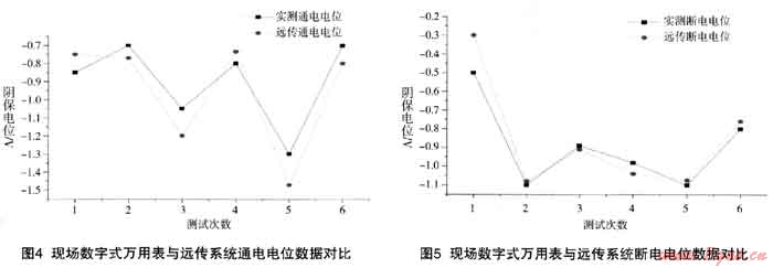 南圖4和圖5所示,南無線采集系統和數字萬用表測得的通/斷電電位數據是很接近的,通電電位數據誤差在15%之內,這可能是由于此處管道受干擾較大,電位變動很快,人工記錄的時間無法完全精確同步,所以,存在一定的人為引入誤差,不完全是儀器的誤差。而斷電電位誤差基本在5%之內。這說明所采用的無線遠傳系統測量結果是準確的,相對于數字式萬用表測量,采用無線采集傳輸系統在測量通/斷電電位時可避免人為讀數造成的誤差,在長時間連續監測數據時能夠大大減少工作人員的勞動強度,提高效率,因此,對于雜散電流干擾區的測量,無線采集傳輸系統具有明顯優勢。
