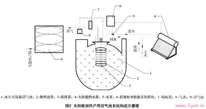 針對這一問題,本文設計了一種太陽輔助加熱戶用沼氣池系統。在沼氣池內設置換熱盤管和攪拌裝置。夏季,沼氣池與太陽能分開工作;冬季,利用太陽熱水器的低溫熱水間接加熱沼氣池。通過現場測試獲取的運行數據,對該系統的實用性進行了分析。初步結果表明,沼氣池的保溫與太陽輔助加熱可實現太陽能與沼氣的互補,充分發揮二者優勢,具有良好的實用性。