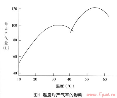 沼氣是有機物質在一定溫度、濕度、pH值和隔絕空氣條件下經微生物發酵而產生的可燃性氣體。影響發酵過程的因素很多,其中發酵溫度尤為重要。在我國農村,沼氣池發酵溫度隨氣溫的變化而變化,沼氣產氣率變化很大。試驗表明:池溫低于10℃,發酵菌幾乎處在休眠狀態,沼氣池基本停止產氣;當池溫在15℃以上時,沼氣發酵才能較好地進行,產氣率為0.1m3/(m3·d)-0.2m3/(m3·d);池溫在20℃以上時,產氣率可達0.4m3/(m3·d)-0.5m3/(m3·d)。圖1是沼氣發酵溫度對產氣率的影響曲線[3]。